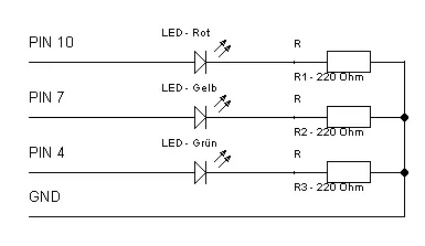 Nun wollen wir eine einfache Ampelschaltung realisieren, dazu benötigen wir folgende Bauelemente: Die Schaltung hierzu ist wieder ähnlich wie auch zur blinkenden LED nur das wir hier 3 LEDs auf einem Steckbrett haben anstatt einer. Diese LEDs werden an 3 verschiedene PINs angeschlossen (hier 10, 7 und 4) und per Quellcode gesteuert. Für diese einfache…