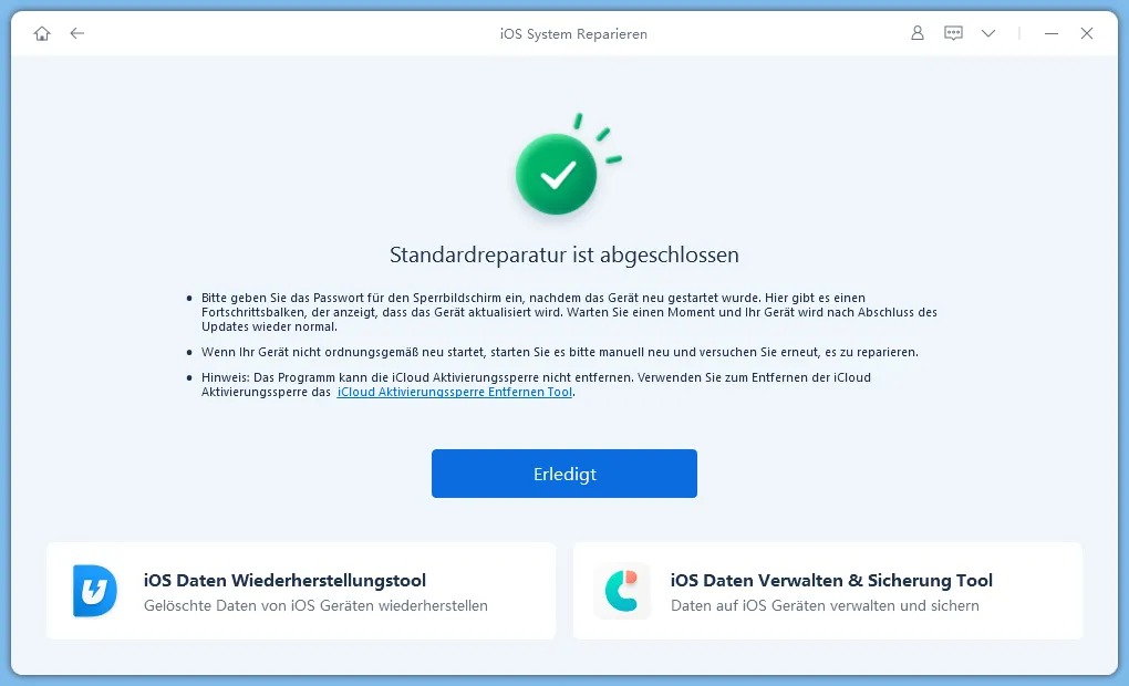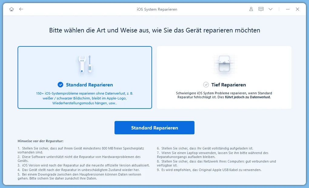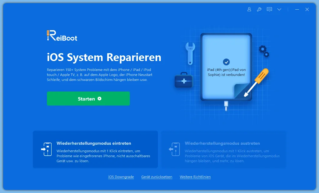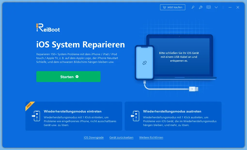 Das Tool bietet dir die Möglichkeit dein iPhone oder auch iPad, mit nur einem klick in den Wiederherstellungsmodus zu versetzen oder zu beenden. Des Weiteren kannst du mehr als 150 iOS Systemprobleme beheben.