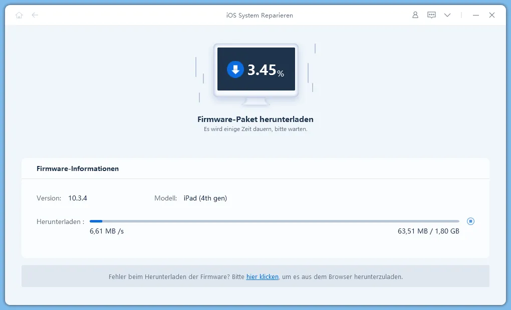 Zunächst wird die passende Firmware aus dem Internet geladen und auf dem Computer gespeichert, dieses dauert je nach Internetgeschwindigkeit und Größe der Datei unterschiedlich lange.