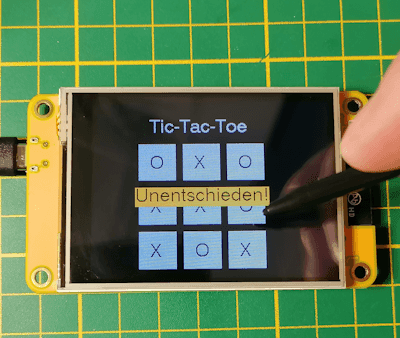 Bei Tic-Tac-Toe handelt es sich um ein einfaches Spiel für zwei Spieler, das auf einem 3×3-Raster gespielt wird. Jeder Spieler wählt abwechselnd ein Feld aus und versucht, eine Reihe von drei seiner eigenen Symbole horizontal, vertikal oder diagonal zu bilden. Auf dem ESP32 mit dem 2,8″ TFT Touchdisplay wird das Spiel grafisch dargestellt, und die Spieler können ihre Züge durch Berühren der entsprechenden Felder tätigen. Das Programm überprüft kontinuierlich, ob ein Spieler gewonnen hat oder das Spiel unentschieden ist, und gibt entsprechende Rückmeldungen aus. Es ist ein unterhaltsames und interaktives Projekt, das die Funktionalitäten des ESP32 und des Touchscreens demonstriert.