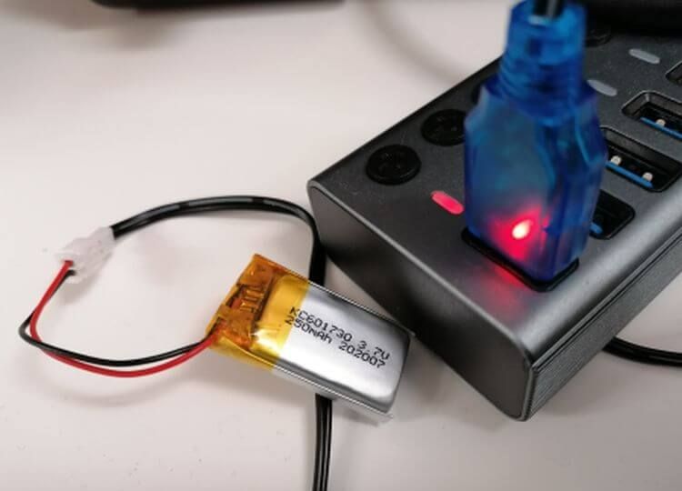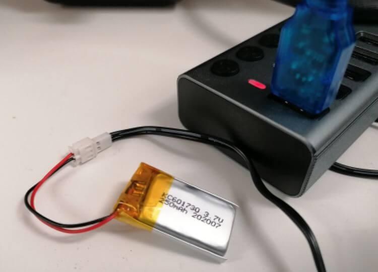 Bevor wir den Mini Trooper starten können, müssen wir den mitgelieferten 3,7 V, 250mAh Akku mithilfe des mitgelieferten USB-Kabel laden.