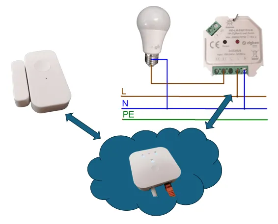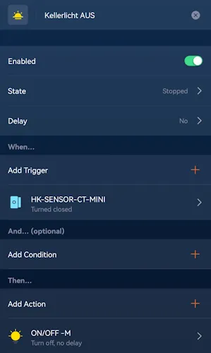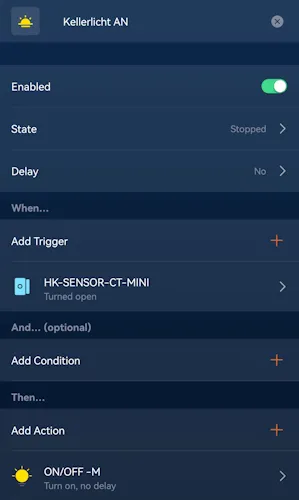 Die Schaltung / Szene soll im Anschluss dazu dienen eine Lampe zu aktivieren, wenn ich meine Kellertür öffne und diese nach 10 Sekunden wieder geschlossen wird.