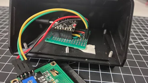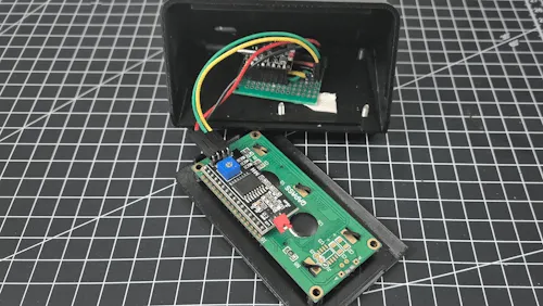 Wenn du das verlinkte Gehäuse verwendest, passt das LCD-Display exakt in die vorgesehene Ausbuchtung. Im Inneren ist zudem ausreichend Platz für eine kleine Lochrasterplatine. In meinem Fall habe ich die Platine jedoch etwas gekürzt, damit sie exakt zwischen die Montageschrauben passt. Da der USB-Stecker eine gewisse Länge hat, solltest du unbedingt prüfen, wie viel Platz du bei deinem Aufbau tatsächlich zur Verfügung hast. Damit die Platine sicher an ihrem Platz bleibt, habe ich sie mit doppelseitigem Klebeband fixiert.