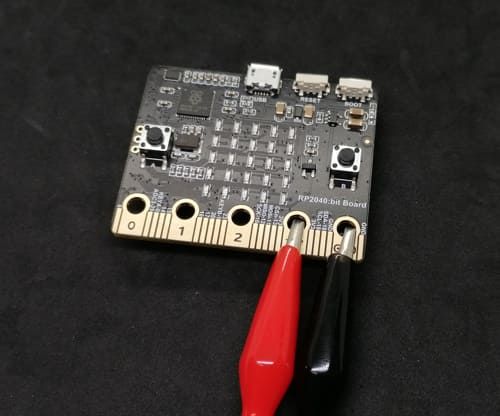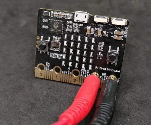 Der RP2040:bit jedoch verfügt über einen 20 poligen Randstecker über welchen wir die Kontakte entweder mit Bananenstecker, Krokoklemmen oder einer speziellen (leider separat zu erwerbenden) Klemme abgreifen können.