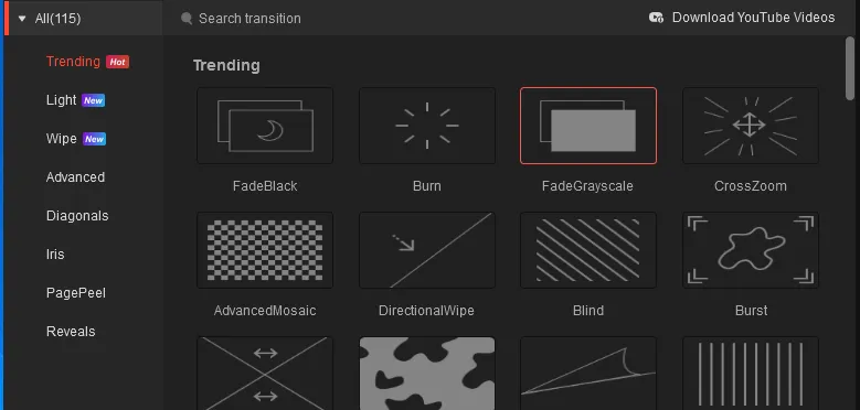 Für Übergänge zwischen Sequenzen kannst du aus einer Liste von 95 Vorlagen wählen. Da wird man quasi zu jedem Thema etwas finden.