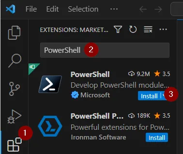 Ich gehe nun davon aus, dass bei dir Visual Studio Code installiert ist. Somit können wir beginnen und die Erweiterung für PowerShell installieren. Dazu klicken wir in der linken Menüleiste auf „Extensions“ (1) und suchen dann nach „PowerShell“ (2) in meinem Fall wähle ich die offizielle Erweiterung von Microsoft und klicke dort auf die Schaltfläche „Install“ (3).