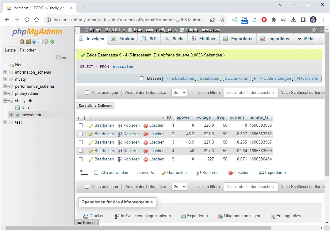 Wenn wir das Skript erfolgreich ausgeführt wurde, dann sehen wir in der Tabelle „messdaten“ eine neue Zeile mit den aktuellen Messdaten.