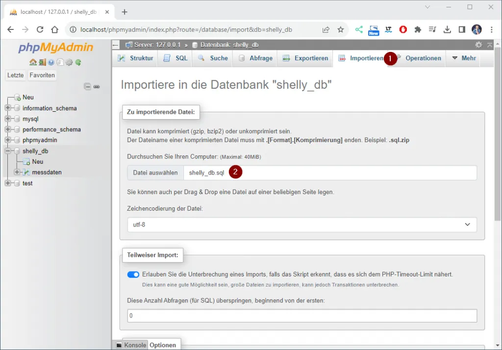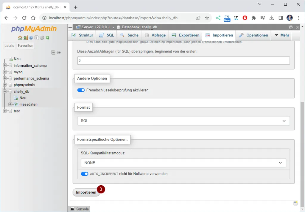 Zum Importieren dieser SQL-Datei navigierst du über den Reiter „Importieren“ (1) und wählst zunächst die Datei (2) aus. Danach scrollst du das Fenster nach unten und wählst die Schaltfläche „Importieren“ (3).