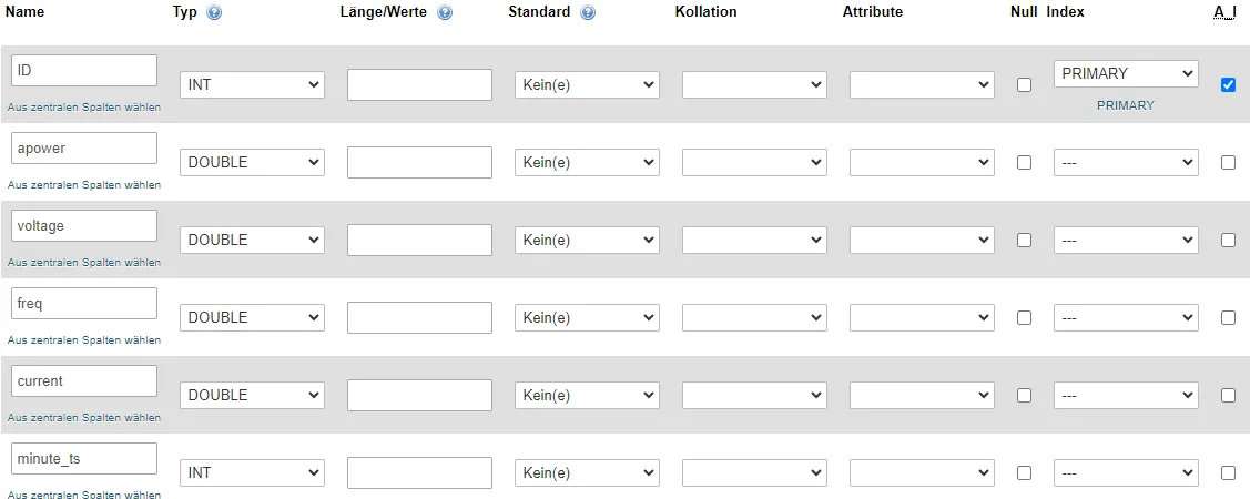 Alle Werte außer der Zeitstempel werden als Gleitkommazahlen ausgegeben und daher legen wir für jeden Wert eine Spalte mit dem Datentyp DOUBLE an. Sowie noch eine Spalte ID welche als INT und mit „auto increment“ angelegt wird. Die MySQL Datenbank legt automatisch auf diese Spalte einen Primärschlüssel.