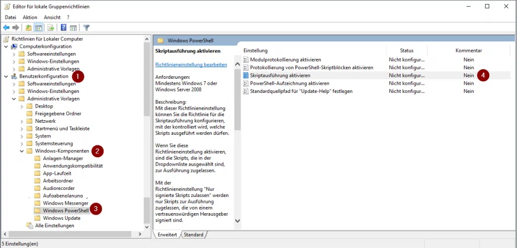 Im neuen Fenster navigieren wir über „Benutzerkonfiguration“ (1), „Windows-Komponenten“ (2), „Windows PowerShell“ (3) und dann auf der rechten Seite den Eintrag „Skriptausführung aktivieren“ (4) mit einem doppelklick wählen.