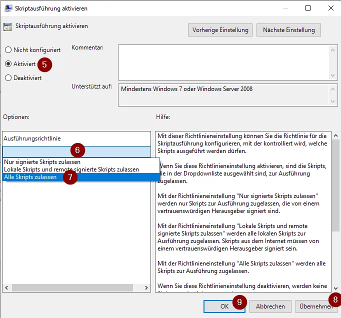 Hier muss nun zuerst der Schalter „Aktiviert“ gesetzt werden und danach aus der Auswahlliste „Ausführungsrichtlinie“ (6) den Eintrag „Alle Skripts zulassen“ (7) wählen. Dieses bestätigen wir mit der Schaltfläche „Übernehmen“ (8) und danach mit „OK“ (9).