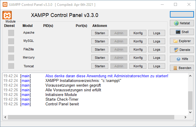 Wenn XAMPP erfolgreich installiert wurde, dann öffnet sich das XAMPP Control Panel aus welchem wir die Server / Dienste starten können.