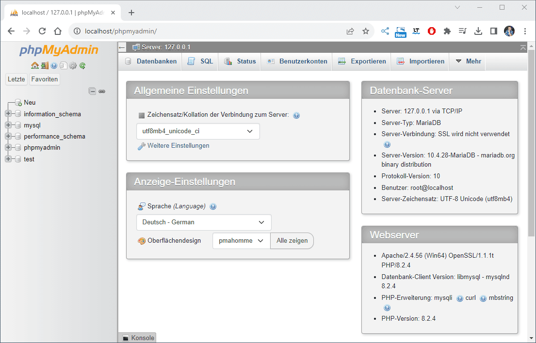 Wenn wir XAMPP installiert haben müssen wir als Nächstes die Datenbank einrichten, das können wir entweder über die Konsole oder bequem per phpMyAdmin erledigen. In meinem Fall mache ich das per phpMyAdmin welches im Browser unter http://localhost/phpmyadmin/ aufgerufen werden kann. Auf der Konsole geht dieses auch, nur hier muss man die gesamten SQL Statements manuell eingeben.