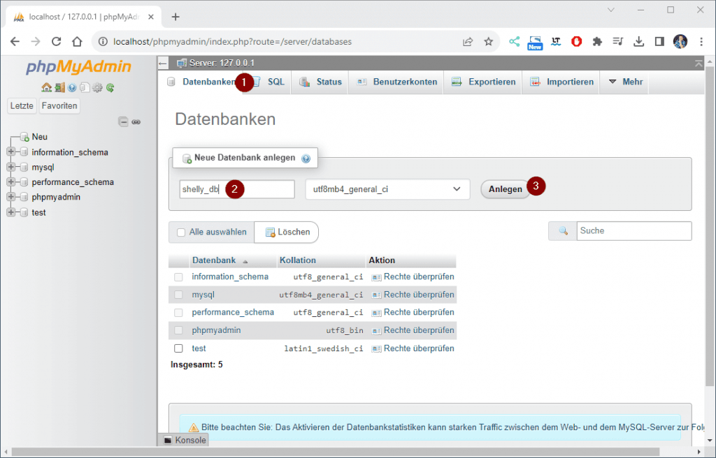 Im ersten Schritt erstellen wir die Datenbank und klicken auf den Reiter „Datenbanken“ (1). Danach vergeben wir unserer Datenbank einen Namen, in meinem Fall nehme ich die Bezeichnung „shelly_db“ (2). Dieses bestätigen wir mit der Schaltfläche „Anlegen“ (3).