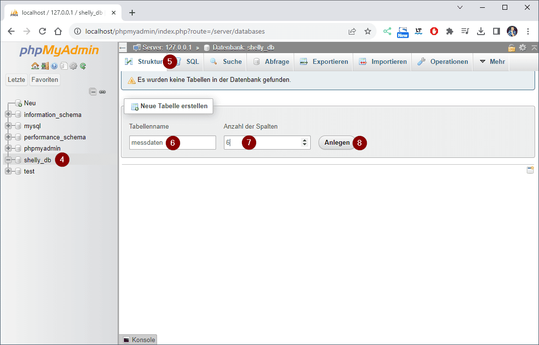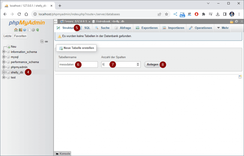 Im zweiten Schritt legen wir uns eine Tabelle an, um dort später die Messwerte abzulegen. Dazu vergeben wir im Reiter „Struktur“ (5) im Feld Tabellenname den Namen der neuen Tabelle, in meinem Fall gebe ich hier „messdaten“ (6) ein. Initial soll diese Tabelle 6 Spalten (7) haben. Diese Auswahl bestätige ich mit der Schaltfläche „Anlegen“ (8).