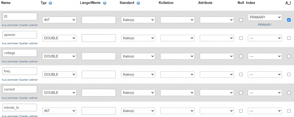 Alle Werte außer der Zeitstempel werden als Gleitkommazahlen ausgegeben und daher legen wir für jeden Wert eine Spalte mit dem Datentyp DOUBLE an. Sowie noch eine Spalte ID welche als INT und mit „auto increment“ angelegt wird. Die MySQL Datenbank legt automatisch auf diese Spalte einen Primärschlüssel.
