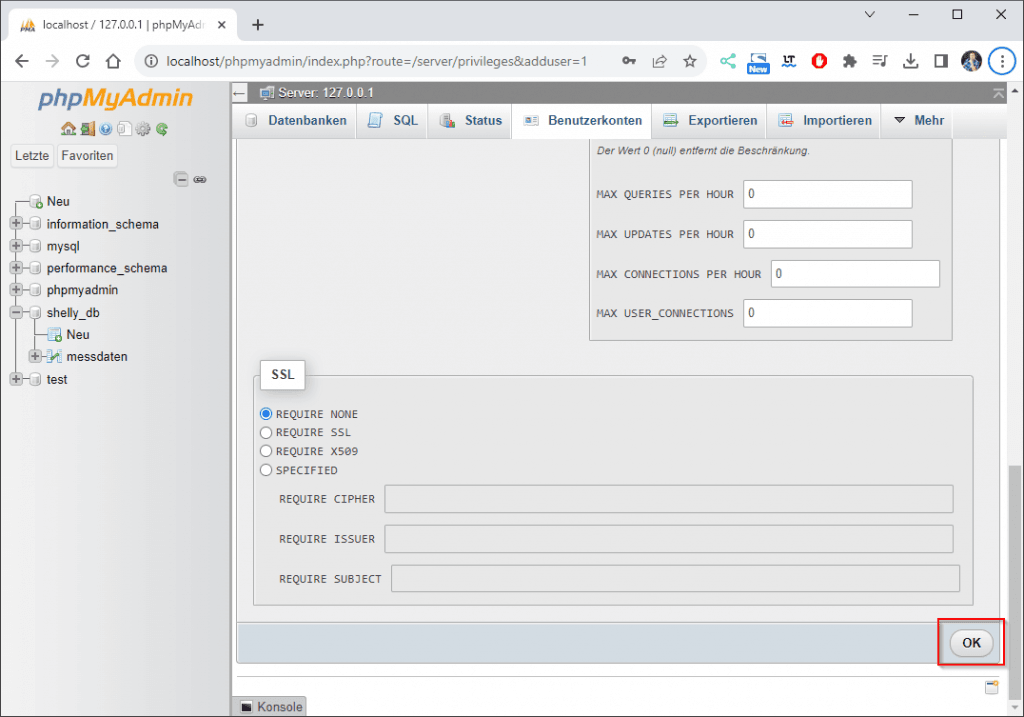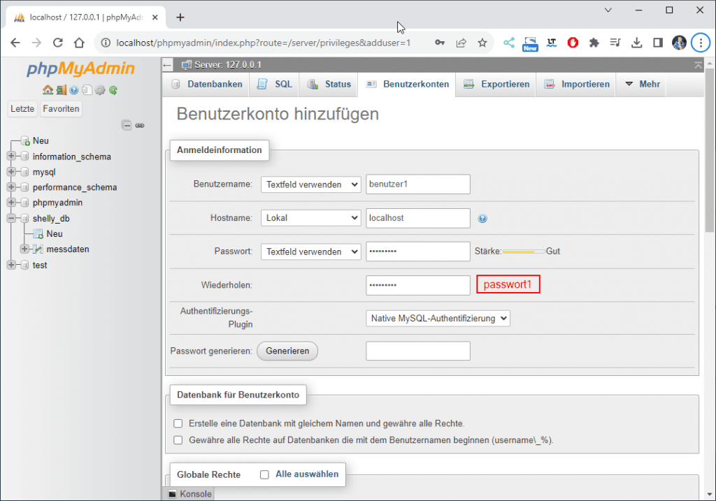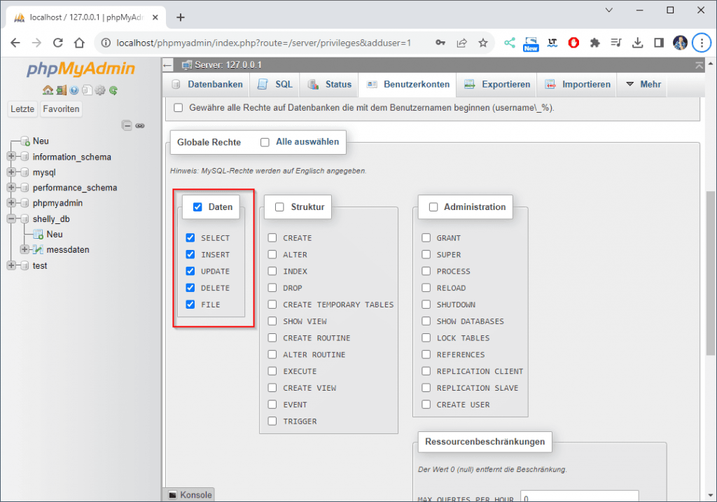 Es ist nie ratsam mit dem Benutzer root zu arbeiten da dieser sehr weitreichende Rechte hat. Über die Oberfläche von phpMyAdmin können wir uns einen Benutzer anlegen und diesem die benötigten Rechte für die Datenbank „shelly_db“ geben.
