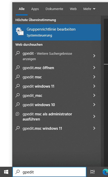 Als erstes klicken wir auf Start und geben danach gpedit ein. Dann wählen wir den Eintrag „Gruppenrichtline bearbeiten“ aus.