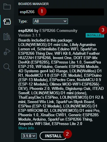 Wenn dieses geschehen ist und die automatische Indexierung durchgelaufen ist, kannst du im Boardverwalter nach esp8266 (1) suchen und dort die Schaltfläche „INSTALL“ (2) betätigen. Wenn die Installation abgeschlossen ist, dann solltest du den Text „INSTALLED“ (3) sehen.