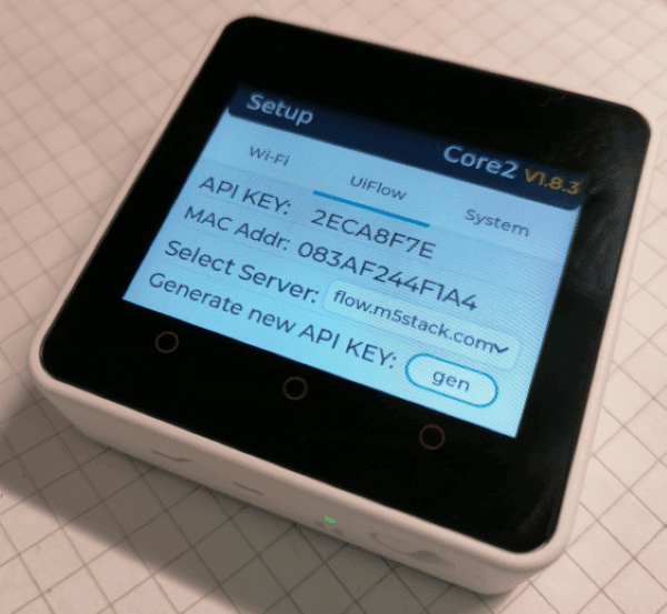 Für die Programmierung in UIFlow benötigen wir einen geflashten Mikrocontroller und den API Key von diesem. Beim Core2 gibt es die Besonderheit das dieser Key vom Display abgelesen werden kann.