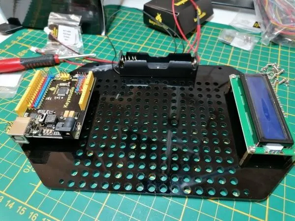 Im vorletzten Schritt werden die Sensoren & Aktoren (Servomotoren, Display, Piezo Buzzer) an den Keyestudio UNO R3 angeschlossen.