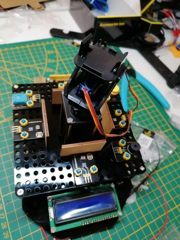 Zum Lieferumfang des DIY Kits gehört neben diversen Sensoren & Aktoren noch einen Keyestudio UNO R3 sowie ein Pan Tilt Bausatz mit Servomotoren vom Typ SG90.