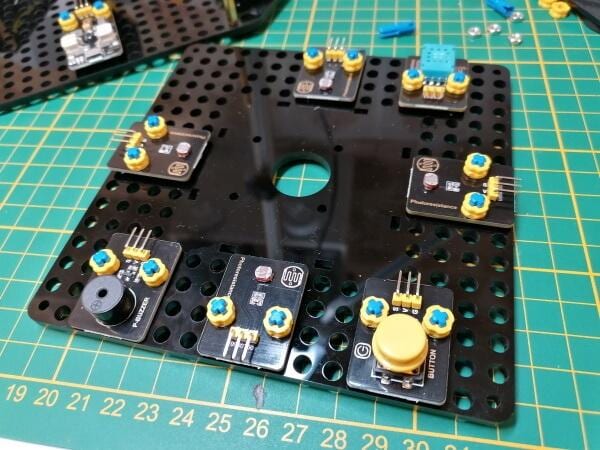 Kommen wir nun zum Aufbau des Kits. Auf der Seite https://ecksteinimg.de/Datasheet/Keyestudio/KS0530/KS0530.pdf findest du die farbig bebilderte Aufbauanleitung (ab Seite 37) in englischer Sprache. Wenn du die Sprache nicht beherrscht wirst du aber trotzdem mit dieser Anleitung zurechtkommen, denn die Bilder sind recht selbsterklärend.
