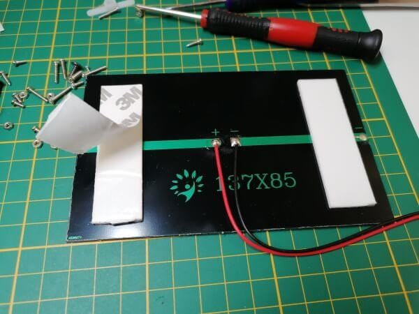 Die Solarpaneele hat auf der Rückseite zwei Klebepads von 3M diese sind sehr stark und daher hast du sozusagen nur eine Chance das Solarpaneel zu korrekt zu positionieren.