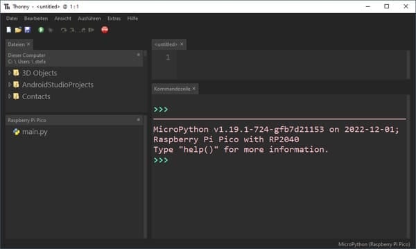 Den Mikrocontroller kannst du typisch für den Chip RP2040 in Micropython programmieren. Hier nutze ich die kostenfreie, leichtgewichtige Thonny IDE welche du unter https://thonny.org/ für Windows, macOS und Linux herunterladen kannst.