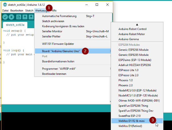 Um den D1 mit der Arduino IDE zu programmieren, muss man das „ESP Package“ installieren, wie dieses gemacht wird habe ich im Tutorial des NodeMCU ausführlich erläutert.