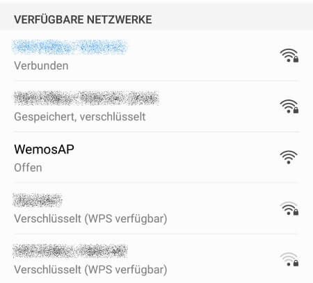 Wenn man nun in einem mobilen Endgerät (Handy, Tablett usw.) nach einem WLAN Netzwerk sucht, sieht man (neben weiteren Netzwerken) auch nun das Netzwerk „WemosAP“ mit dem Zusatz „Verschlüsselt“