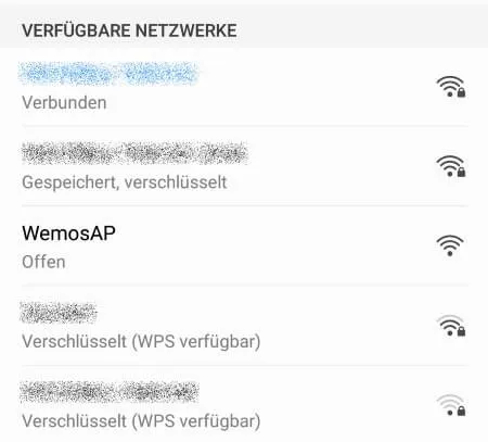 Wenn man nun in einem mobilen Endgerät (Handy, Tablett usw.) nach einem WLAN Netzwerk sucht, sieht man (neben weiteren Netzwerken) auch nun das Netzwerk „WemosAP“ mit dem Zusatz „Verschlüsselt“