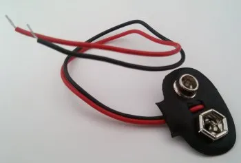 Den Adapter für eine 9V Blockbatterie gibt es mit einem passenden Stecker und mit zwei offenen Drähten für die Schraubklemmen.