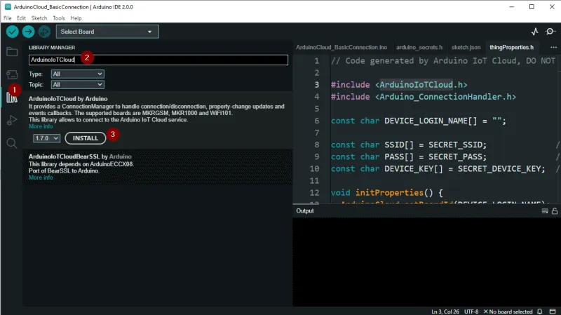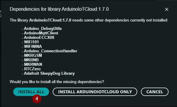 Zunächst öffnen wir den Bibliotheksmanager (1) und geben in die Suchleiste den Text „ArduinoIoTCloud“ (2) ein. Am Eintrag „ArduinoIoTCloud by Arduino“ wählen wir die Schaltfläche „INSTALL“ (3), danach im neuen Dialog wählen wir die Schaltfläche „INSTALL ALL“ (4), damit werden zusätzlich alle benötigen Bibliotheken installiert.