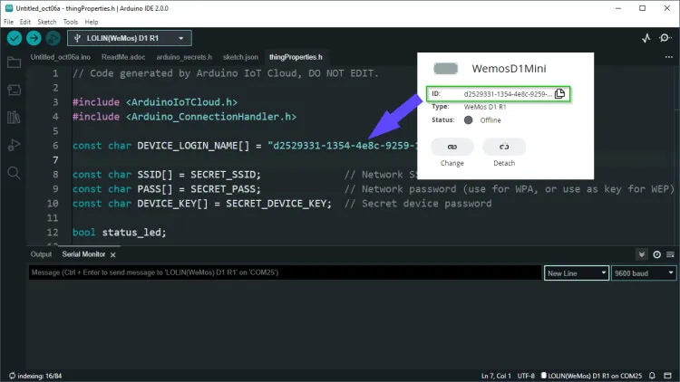 Der Wert „DEVICE_LOGIN_NAME“ in der Datei / dem Reiter „thingProperties.h“ wird mit dem Wert „Device ID“ aus dem Dialog während der Installation befüllt. Diesen Wert findest du später im Reiter „Things“ wieder!