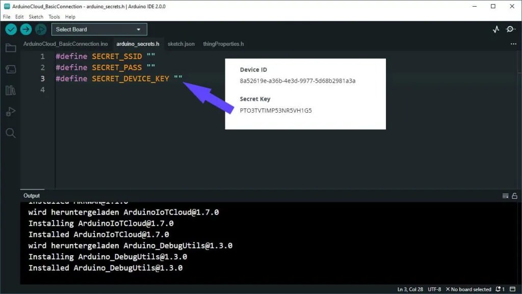 In der Datei / dem Reiter „arduino_secrets.h“ geben wir die Daten von der Wi-Fi-Verbindung ein sowie den Wert für den SECRET_DEVICE_KEY.