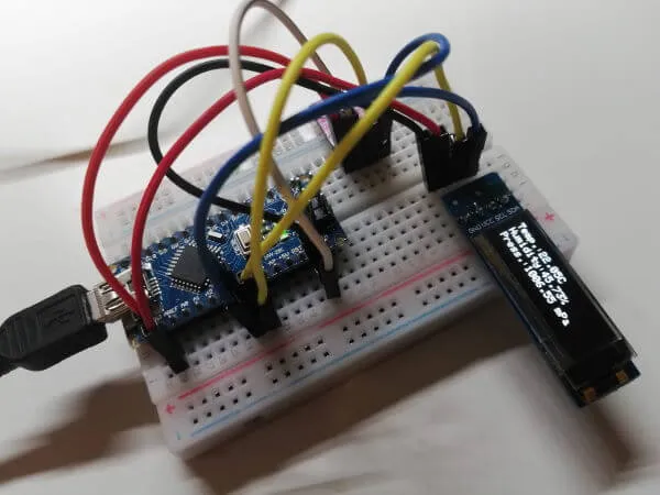 Der Sensor BME280 sowie das 0,91-Zoll-Display kommunizieren über SPI, durch die unterschiedlichen Adressen können diese sich die Pins A4 & A5 „teilen“.