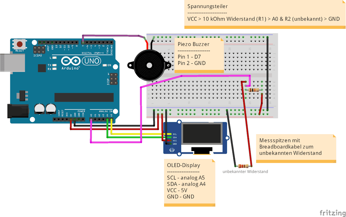 Bevor wir zur Programmierung kommen, werfen wir einen Blick auf den elektrischen Aufbau. Die gesamte Schaltung basiert auf einem einfachen Spannungsteiler, bestehend aus einem bekannten Referenzwiderstand und dem zu messenden Widerstand. Ergänzt wird das Ganze durch ein OLED-Display, auf dem der ermittelte Wert direkt angezeigt wird, sowie einem Piezo-Buzzer, der bei nahezu 0 Ohm ein akustisches Signal ausgibt.