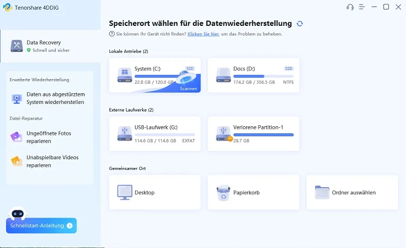 Tenorshare 4DDiG ist eine professionelle Software zur Wiederherstellung von Festplattendaten. Tenorshare 4DDiG kann gelöschte Dateien von Festplatten wiederherstellen und verlorene Daten von formatierten oder beschädigten Festplatten retten. Es unterstützt die Wiederherstellung von Daten von aller Art von Festplatten, SSDs, USB-Laufwerken und Speicherkarten. Es ist die effektivste Lösung für Sie, um Ihre verlorenen oder beschädigten wichtigen Dateien schnell und einfach wiederherzustellen.