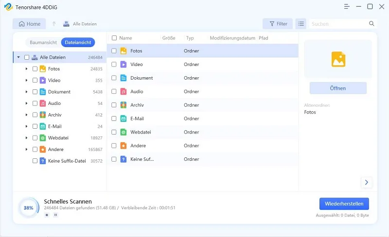 Der Scanvorgang wird gestartet. Der Scan beginnt und zeigt alle gefundenen Dateien an. Mit der 4DDiG Datenrettung-Software haben Sie die Möglichkeit, eine Vorschau dieser Dateien zu sehen, während sie gefunden werden. Wenn Sie mit dem abgeschlossenen Scan nicht zufrieden sind, können Sie sich für einen „Deep Scan“ entscheiden.