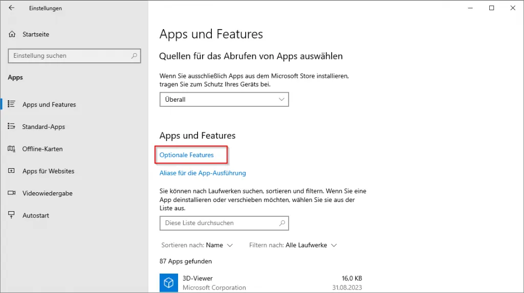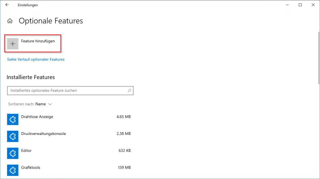 Damit wir die Daten von Windows und der Hardware auslesen können, müssen wir SNMP installieren, dazu navigieren wir über Windows-Taste + X > Einstellungen. In der Übersichtsseite wählen wir Apps und dort dann „Optionale Features“. Auf der neuen Seite wählen wir aus dem oberen Bereich „Feature hinzufügen“ und suchen nach „snmp“. Es sollten nun zwei Pakete angezeigt werden (siehe Grafik).