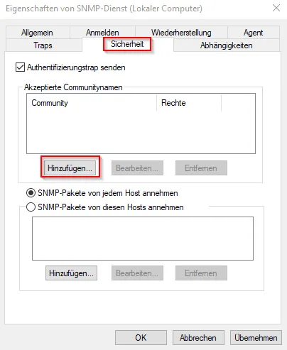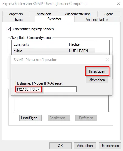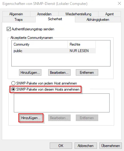 Danach wählen wir „SNMP-Pakete von diesen Hosts annehmen“ aus und wählen die Schaltfläche Hinzufügen. Nun geben wir die IP-Adresse des Zabbix Servers ein (vom Raspberry Pi) und bestätigen ebenso diese Auswahl mit Hinzufügen.
