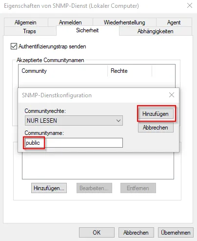 Es sollte sich der Dialog „Eigenschaften von SNMP-Dienst (Lokaler Computer)“ öffnen, in welchem wir zunächst in den Reiter Sicherheit wählen. Im ersten Schritt fügen wir einen neuen Communitynamen hinzu. Dieser Communityname lautet im System Zabbix per Default „public“.