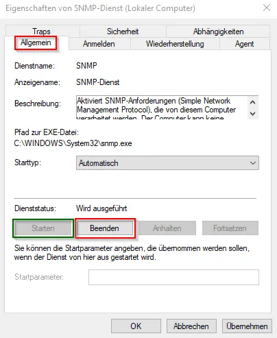 Im letzten Schritt müssen wir nun noch den Dienst einmal neu starten, dazu klicken wir im Reiter „Allgemein“ auf die Schaltfläche „Beenden“ und danach auf „Starten“.