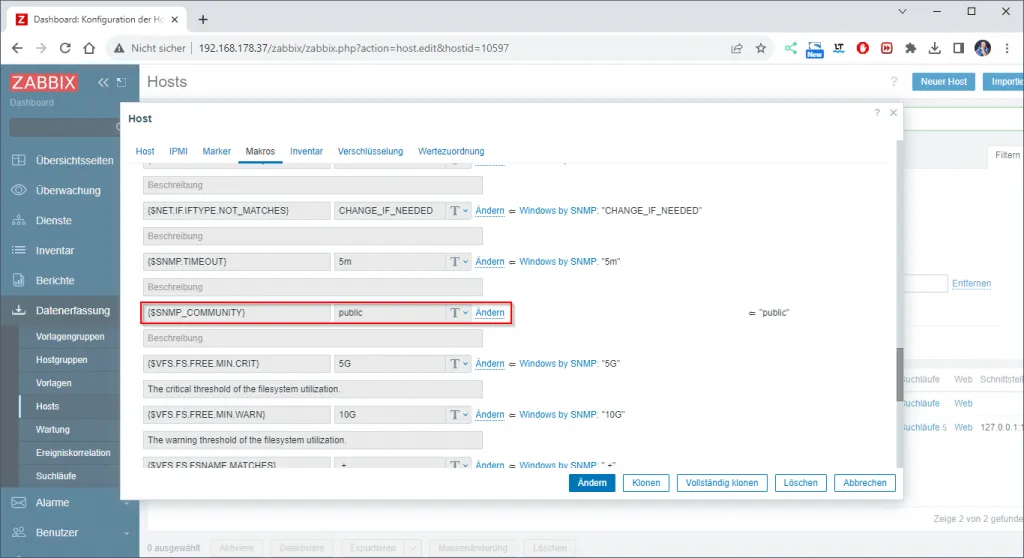 Schritt 2.5 – prüfen der Variable {$SNMP_COMMUNITY} in Makros