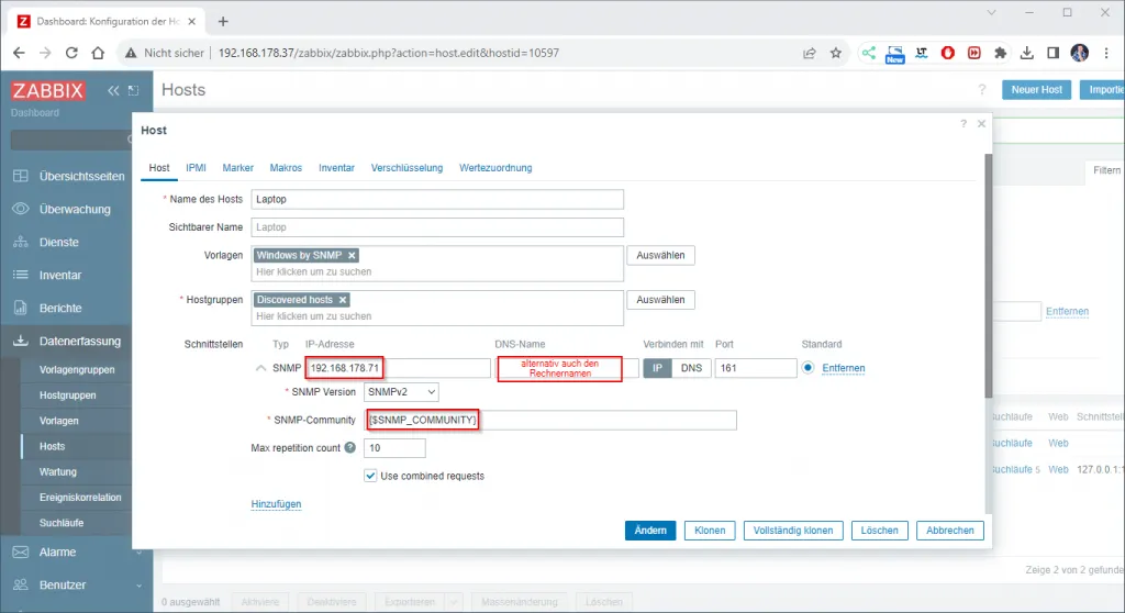 Nun können wir im Browser zur Weboberfläche von Zabbix wechseln und dort unseren vorbereiteten Windows 10 PC einrichten.