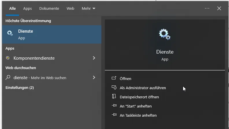 Zunächst öffnen wir das Windows Menü und suchen nach „Dienste“, dort wird im oberen Bereich „Höchste Übereinstimmung“ der Eintrag „Dienste – App“ angezeigt, welchen wir auswählen.