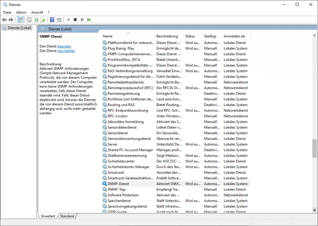 Nun suchen wir aus der Tabelle den Eintrag SNMP-Dienst aus und betätigen einen Doppelklick auf diesen.