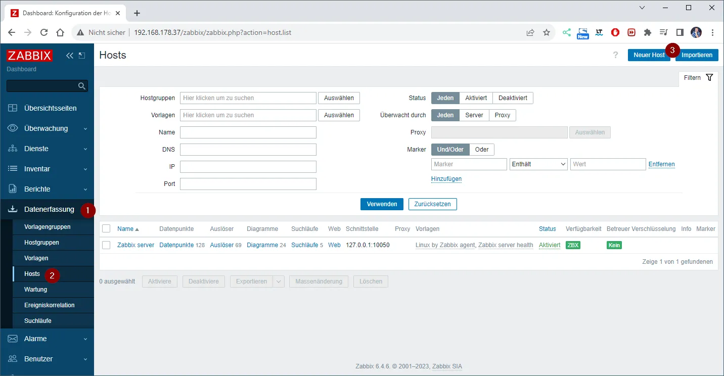 Zuerst legen wir einen neuen Host an, in dem wir über das Menü Datenerfassung (1) > Hosts (2) zur Seite „Hosts“ navigierst.